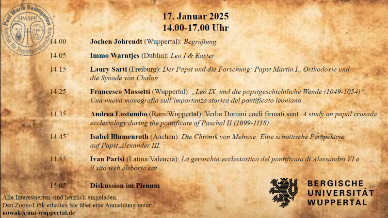 Das Paul Maria Baumgarten-Institut für Papstgeschichte an der Bergischen Universität Wuppertal veranstaltet am 17. Januar einen Studientag, der auch online verfolgt werden kann. Unter den Referenten ist auch Federica G. Giordani vom RIGG.