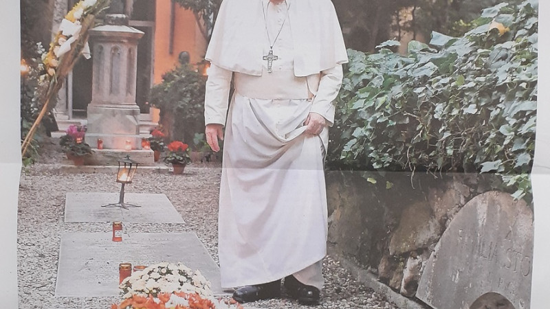 Die deutsche Ausgabe des Osservatore Romano berichtet immer wieder ausführlich über das deutsche Kolleg und den Friedhof. Die Ausgabe vom 6. November bringt eine Würdigung des Papstbesuchs zu Allerseelen. Nach der Seelenmesse schritt der Papst an den Gräbern der Görres-Gesellschaft vorbei. Das ganzseitige Foto des Osservatore zeigt ihn am Grab von Mons. Ludwig Voelkl, der das Institut 1959-1971 leitete. Dort liegt auch Kurt Körbel (1930-1969), der jung verstorbene Assistent des RIGG (beide gewürdigt in Personenlexikon zur Christlichen Archäologie).