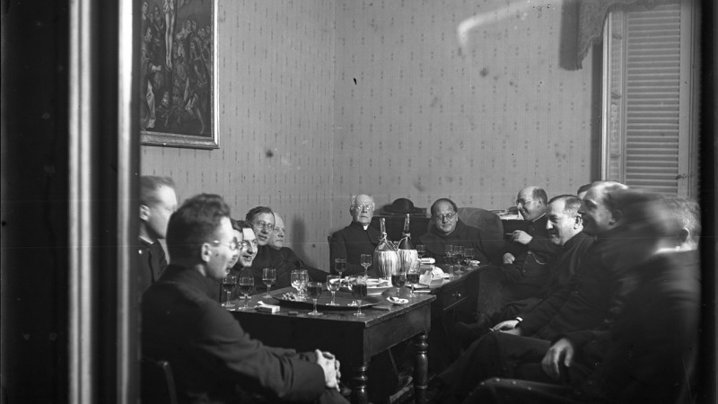 Das Foto ist wohl in einem der Zimmer des Prälatengangs am Campo Santo Teutonico aufgenommen. Es stammt von 1927, als man das 50-jährige Bestehen des Kollegs feierte. Nicht fehlen dürfen die Zigarren und der Rotwein-Fiasco, der hier ca. 1,5 Liter zu fassen scheint. Zu sehen sind u.a. Adolf Kalsbach, Joseph Prill, Bruno Katterbach OFM und Emil Göller.