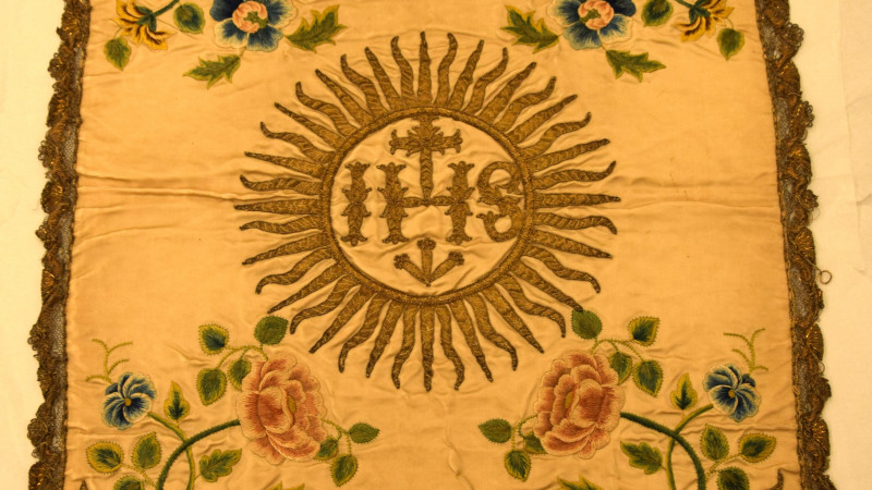 Questo manufatto è meno elaborato del precedente, ma molto più interessante, perché mostra di quale virtuosismo fossero capaci le ricamatrici locali, spesso vergini consacrate, le uniche che continuarono a realizzare paramenti dopo la Riforma. Quel velo da calice, inoltre, induce a riconoscere la complessità semantica dei fiori come elemento decorativo, e del trigramma di Cristo nei paramenti liturgici. Si potrebbe associare i primi al territorio di Haarlem, e il secondo all’attività missionaria dei Gesuiti o dei Francescani, ma ciò non è scontato: non è chiaro, infatti, chi eseguì quest’opera. Per di più, manufatti tessili con fiori e il trigramma di Cristo furono commissionati anche nella Svezia luterana.
