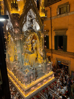 Ieri, 3 settembre, è tornato il grande momento: la sera si è svolta la processione della macchina gotica illuminata di Santa Rosa, patrona di Viterbo. A marzo, i collaboratori dell'Istituto Romano avevano fatto una gita a Viterbo e ora Federica Giordani ha potuto scattare delle foto da vicino dalla sua camera.