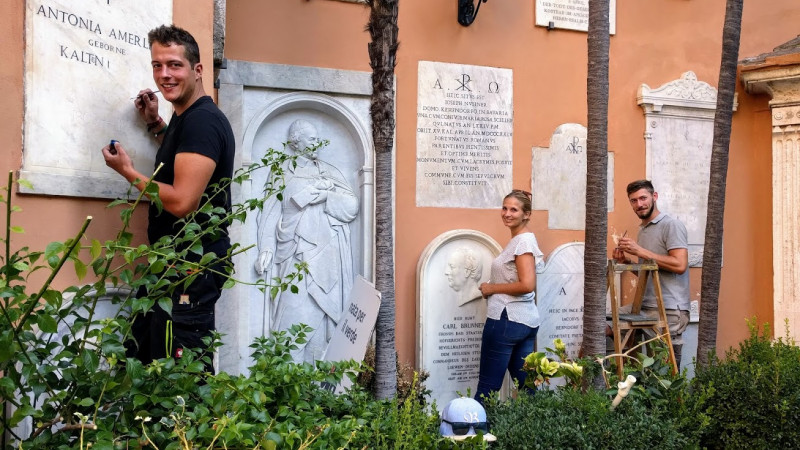 Seit 2002 führen die Münchener Kunsthandwerkerschulen unter der Projektleitung von Clemens Sohmen von der Fachschule für Steintechnik und Sascha Priester, Lehrbeauftragter für Klassische Archäologie an der Uni München, Erasmus-Projekte durch, die beständig nach Rom führen. Damit geben sie jungen Erwachsenen eine europäische Perspektive, und davon profitiert auch seit Jahren der Campo Santo Teutonico, dessen historische Grabdenkmäler ausgezeichnet restauriert wurden, so dass es eine wahre Freude für alle Besucher des Vatikans ist. Denken Sie daran: Jetzt ist die rechte Zeit, seinen nächsten Romurlaub zu planen!