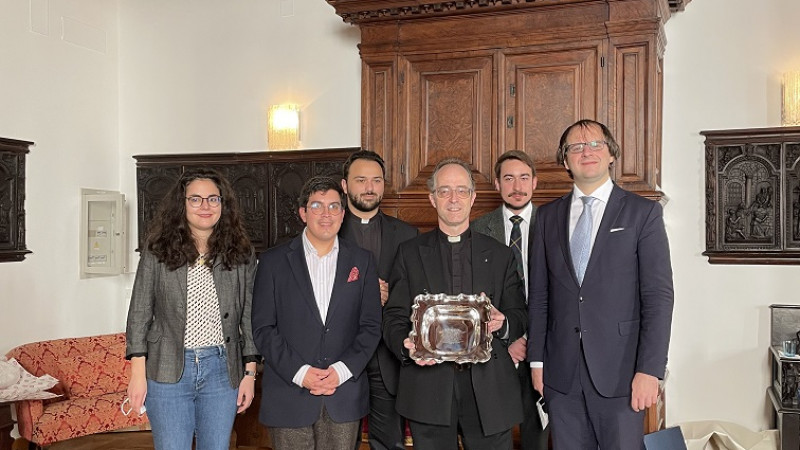 Vor der üblichen Abreise aus Rom zu Weihnachten haben 17 derzeitige und ehemalige Assistenten und Stipendiaten dem Direktor eine vorzeitige Geburtstagsüberraschung bereitet. Auf der Silberschale steht, umgeben von den Stifternamen, die Inschrift: