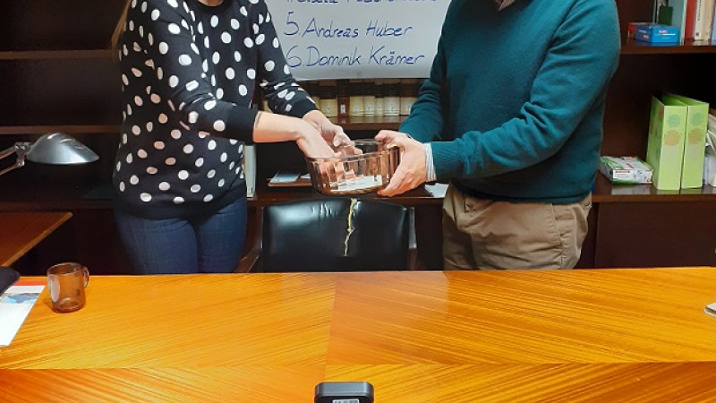 Aus den sechs Teilnehmerinnen und Teilnehmern wurde im Assistentenzimmer in einer Zoom-Schaltung von der Glücksfee Dr. Mair der Gewinner gezogen: Es war Janosch Dörfel. Für den zweiten und dritten Platz gab es Trostpreise.