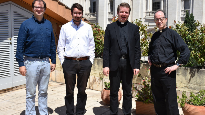 Im Juni ergab sich die Gelegenheit, dass drei Kustoden der römischen Studienbibliothek Joseph Ratzinger / Benedikt XVI. am Campo Santo Teutonico zusammentrafen: Florian Schwarz (2015-2017), Heinrich Heidenreich (2019-2021) und Martin Grobauer (2021-2023), die je mit einem Stipendium der Fondazione Vaticana an ihrer Promotion arbeiten. Dr. Schwarz vertrat jüngst das RIGG auf der Matinée zu Ehren Benedikts XVI. in München. Die Studienbibliothek ist in diesen Jahren zu einer ausgezeichneten Sammlung mit 2.034 Titeln in ca. 40 Sprachen ausgebaut worden.
