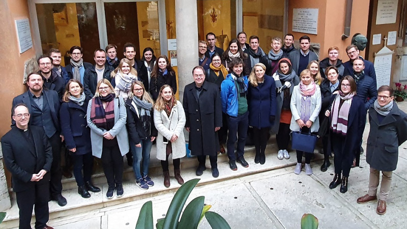 Regelmäßig finden Stipendiatinnen und Stipendiaten der Hanns Seidel-Stiftung (München), der bedeutendsten Begabtenförderung Bayerns, ihren Weg nach Rom und besuchen das Römische Institut der Görres-Gesellschaft, so auch im Januar. Wie bereits im letzten Jahr führte Stefan Heid die 36-köpfige Gruppe der Promotionsfachtagung "Die italienische Hauptstadt als Quelle europäischer Identität" unter Leitung von Dr. Andreas Burtscheidt in den Campo Santo Teutonico als Ort der Wissenschaft und der Zuflucht ein.