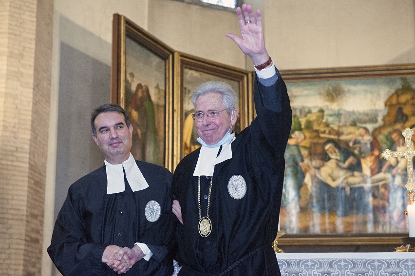 In einer symbolischen Zeremonie am 8. Dezember in der Kirche übergab Aldo Parmeggiani die Amtskette und den Amtsstab an den neuen Camerlengo Franco Reale. Der Jurist Reale ist auf der letzten Generalversammlung mit überwältigender Zustimmung gewählt worden. Auch er gehört der Görres-Gesellschaft an. Wir Görresianer können froh und dankbar sein, dass eine so glatte und vielversprechende Amtsübergabe gelungen ist.