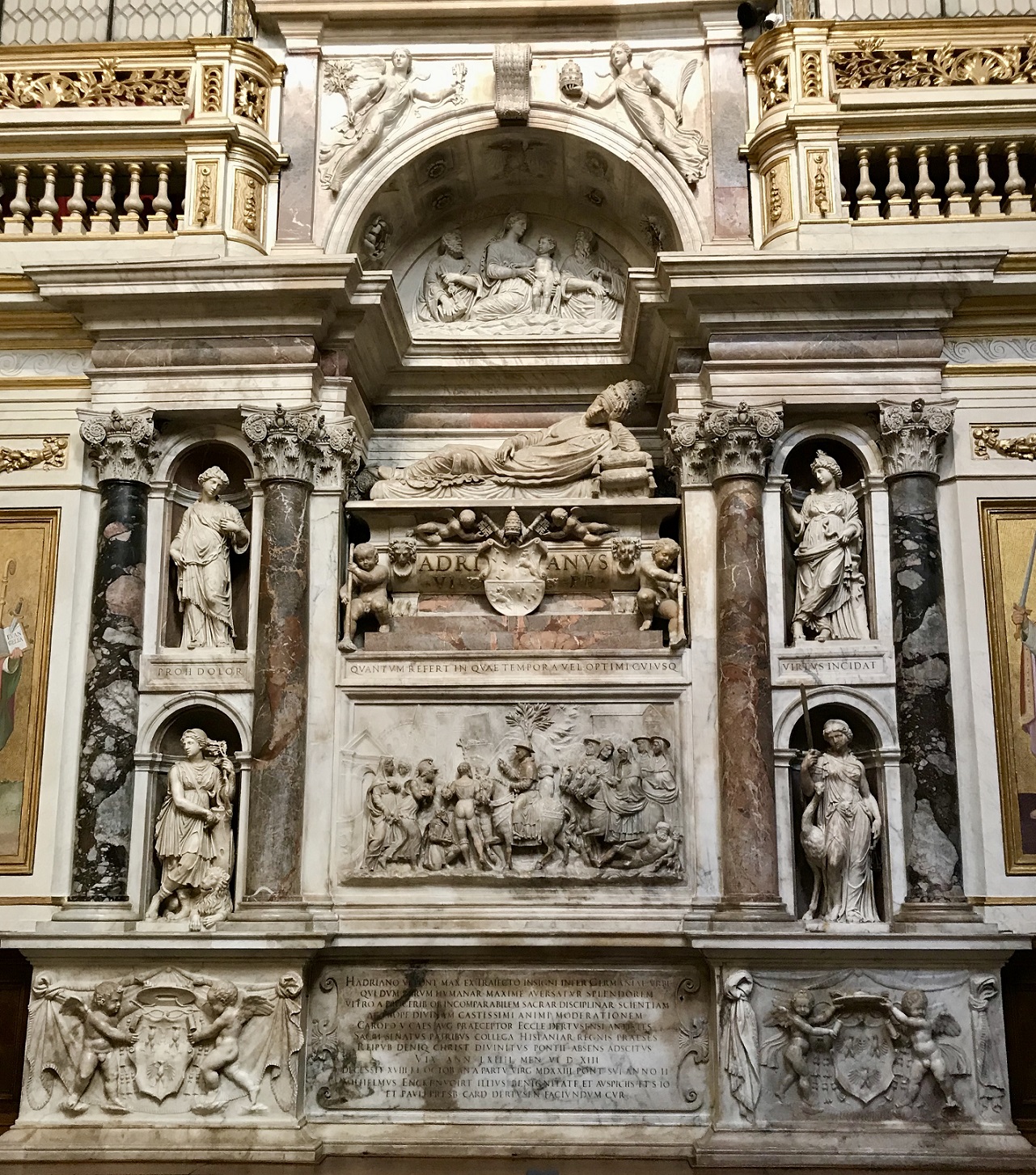 Das Grabmal, ein Werk von Baldassare Peruzzi, zeigt oben die Gottesmutter mit dem Kind, darunter die liegende Figur des Papstes, eingerahmt von den vier Kardinaltugenden. Ein Relief zeigt den Papst, wie er durch die Porta San Paolo in Rom Einzug hält: In der Mitte ist Hadrian selbst zu sehen, dahinter sein Gefolge aus Beamten und kirchlichen Würdenträgern sowie einige Hellebardenträger, die ihn zu Fuß eskortieren.