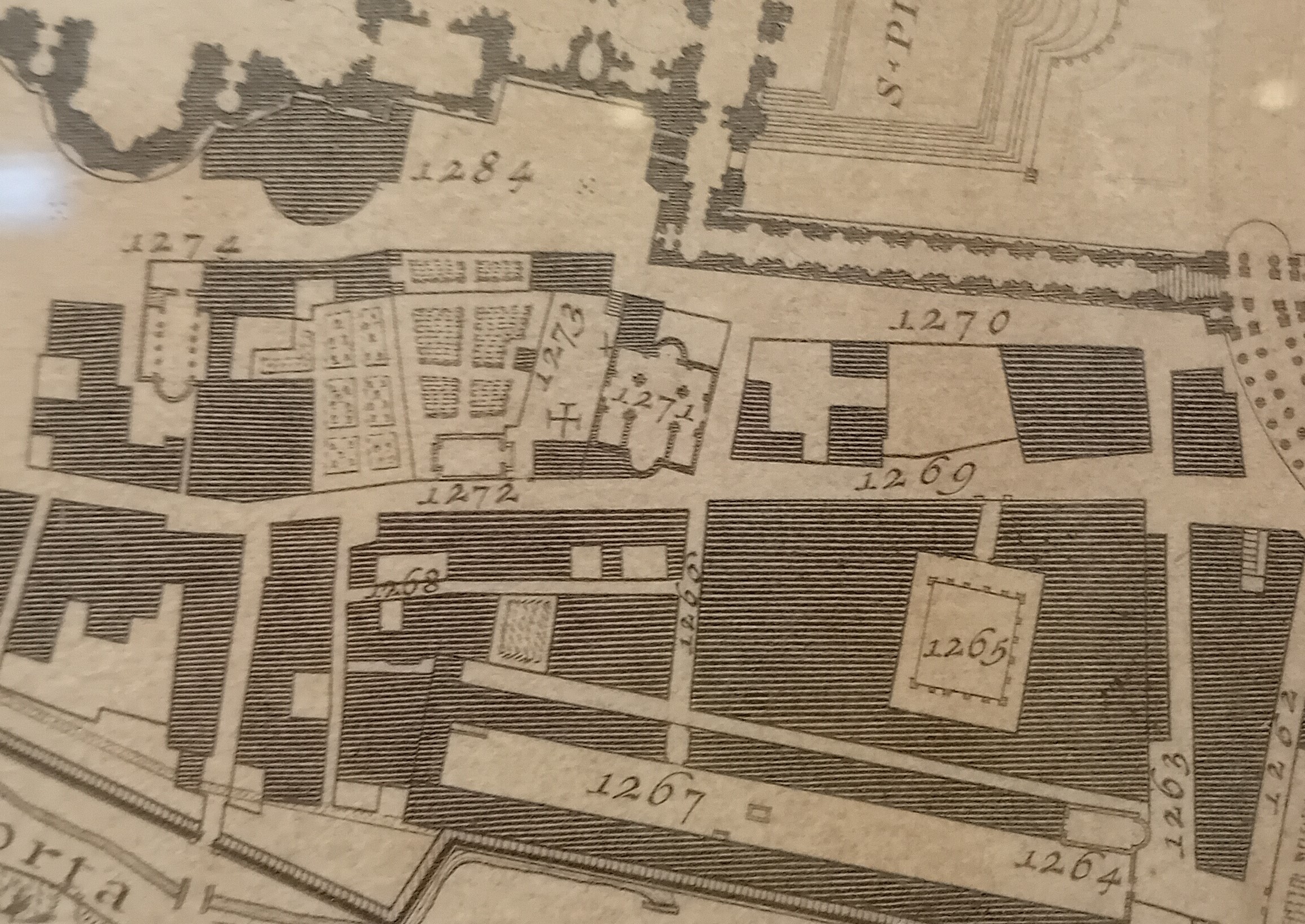 The city map of Rome by Giovan Battista Nolli from 1748 - it hangs on the first floor of the German Archaeological Institute - shows the Campo Santo Teutonico differently than it is today. At no. 1272 you can see the former oratory, which was located where Pope Benedict XVI's auditorium is today and where the Görres Lectures take place.